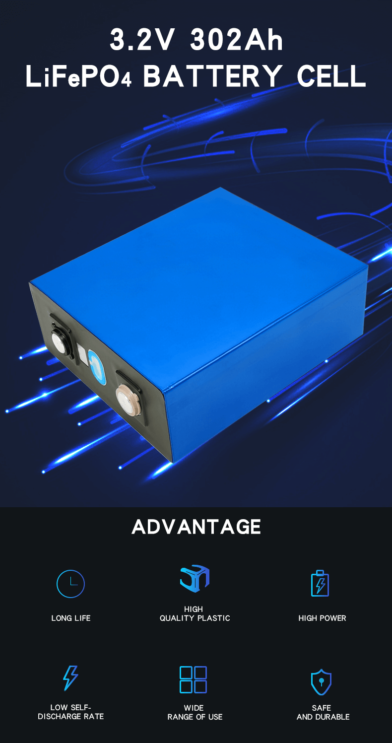ਇਸ UL ਪ੍ਰਮਾਣਤ 3.2V 302Ah LiFePO4 ਬੈਟਰੀ ਸੈੱਲ ਦੇ ਹੇਠ ਲਿਖੇ ਫਾਇਦੇ ਹਨ:
